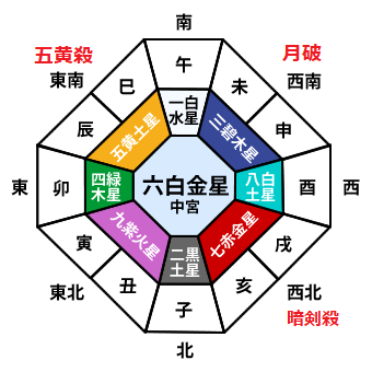 中宮に六白金星が廻座する2021年は、三碧木星の廻座する「南西」が「歳破」、七赤金星が廻座する「北西」が「暗剣殺」となり、五黄土星が廻座する「東南」と共に全ての人にとって凶方位となります。