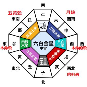 中宮に六白金星が廻座する2021年は、三碧木星の廻座する「南西」が「歳破」、七赤金星が廻座する「北西」が「暗剣殺」となり、五黄土星が廻座する「東南」と共に全ての人にとって凶方位となります。