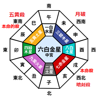 中宮に六白金星が廻座する2021年は、三碧木星の廻座する「南西」が「歳破」、七赤金星が廻座する「北西」が「暗剣殺」となり、五黄土星が廻座する「東南」と共に全ての人にとって凶方位となります。