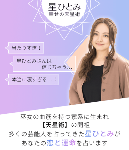 あなたの持つ能力を最大限伸ばす方法も伝授してくれる星ひとみ先生に、あなたの悩みを解決へと導いてもらいましょう。