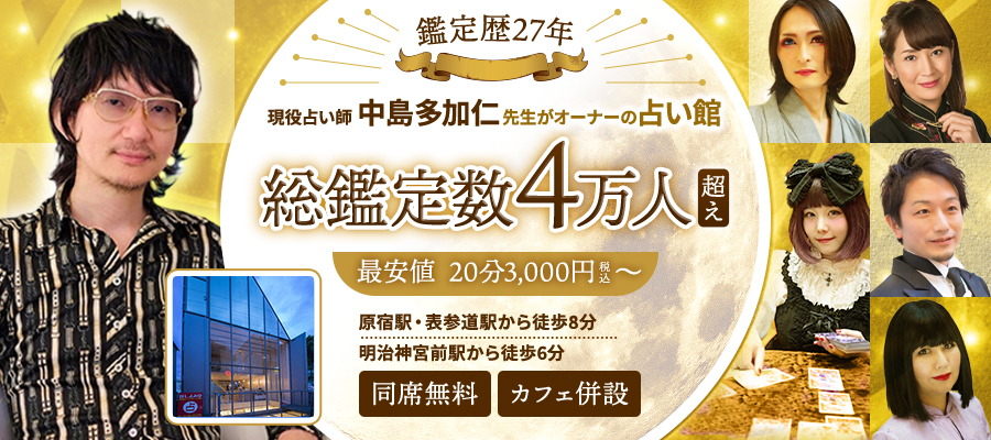 | 鑑定場所 | 東京の占いの館「占い優占」と「神秘堂」 ・有楽町占い優占…(火曜日) 〒100-0006 東京都千代田区有楽町1-3-7 美宝ビル3F ・新宿占い神秘堂…(木曜日・金曜日) ・赤坂占い優占…(土曜日) |
