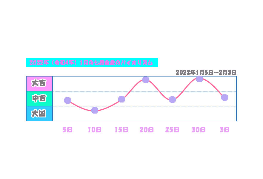 今回は、七赤金星の2022年1月の日運バイオリズムとともに、細かく分けた運勢ごとについてご紹介します。