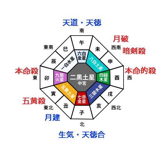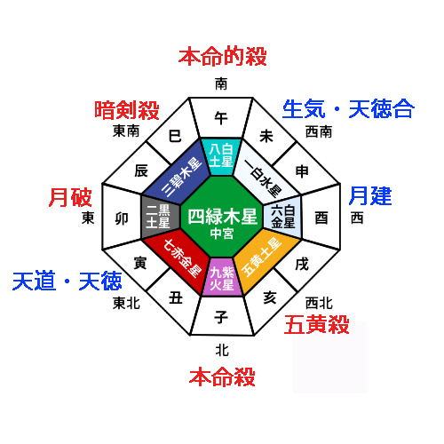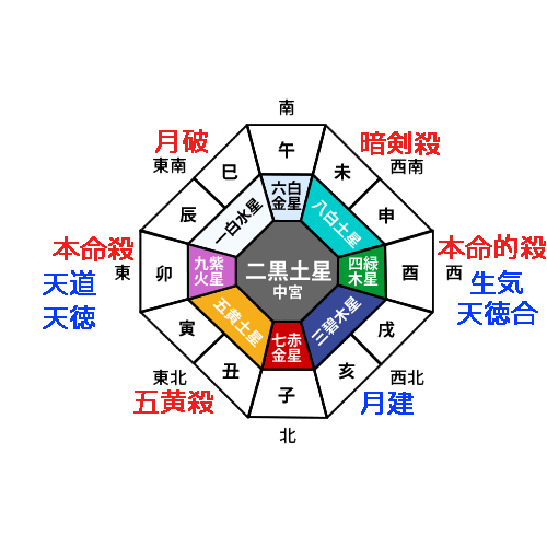 反対の西南西には、「太歳合(たいさいごう)」が位置し、さらに「歳破(さいは)」の大凶殺も巡ります。