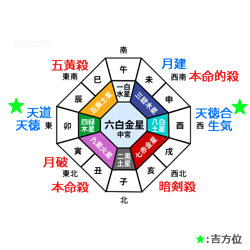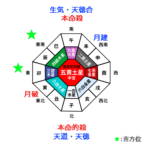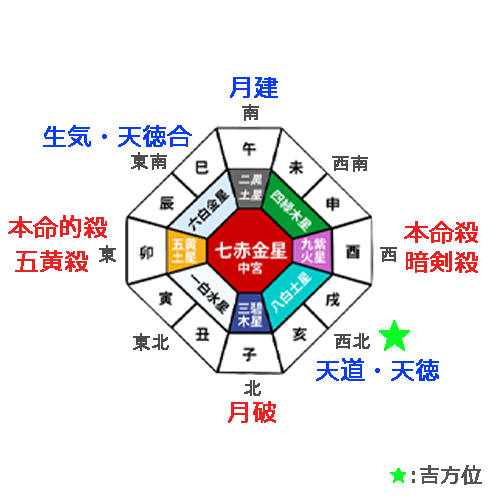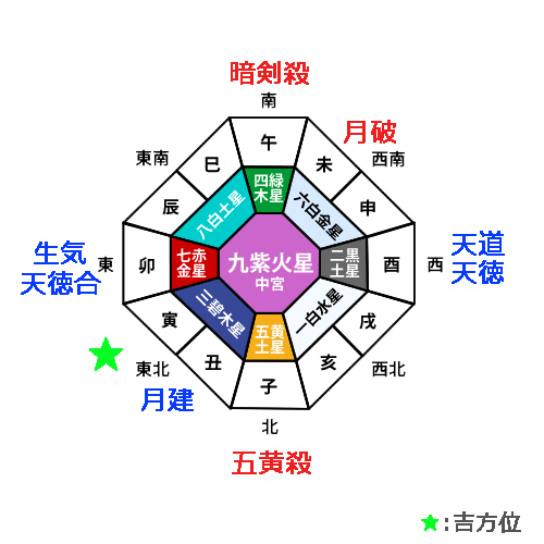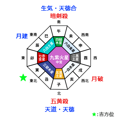 九紫火星の年盤で、「本命的殺」の大凶殺と同じ方位に位置する「歳徳神」は、その方位に移動すると福をもたらし、何事にもプラスの影響を引き寄せる吉作用があります。