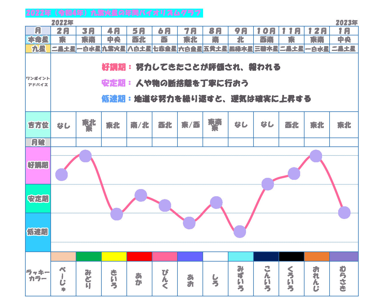 - 13 九紫火星・2022年の九星気学においての1年間の運気の流れ(2022年2月~2023年1月の運気のバイオリズム)