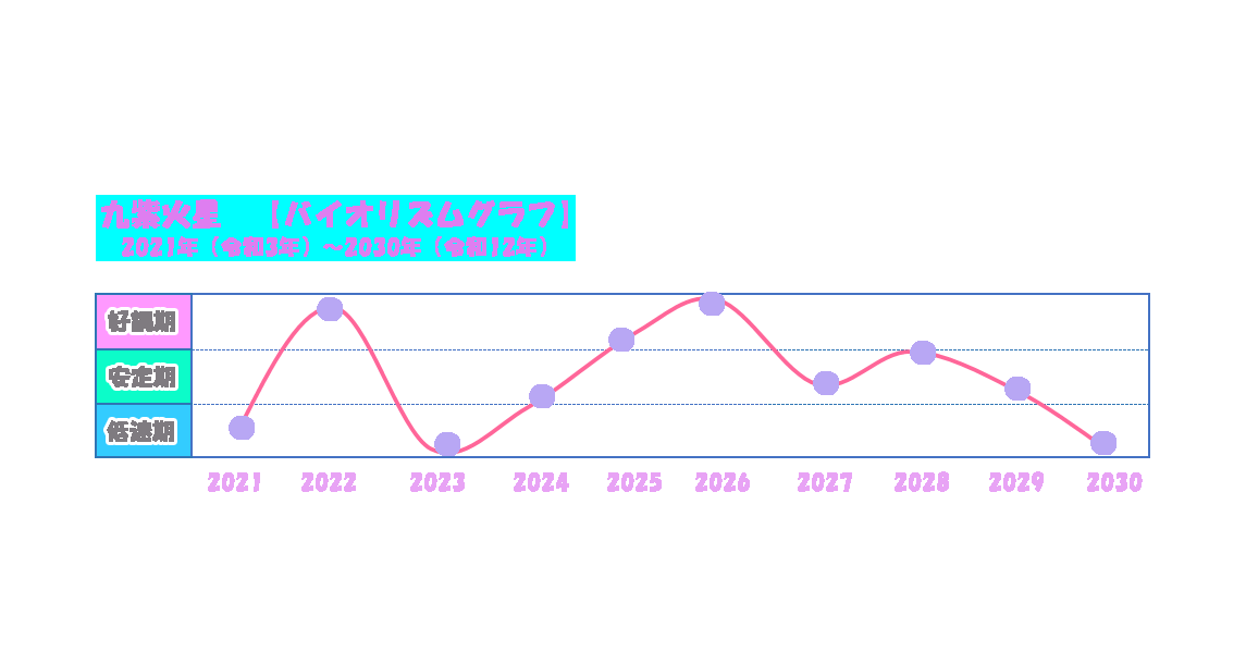 今回は、九紫火星の運勢について2022年の一年間だけに限らず、2021年から2030年のバイオリズムまでご紹介します。