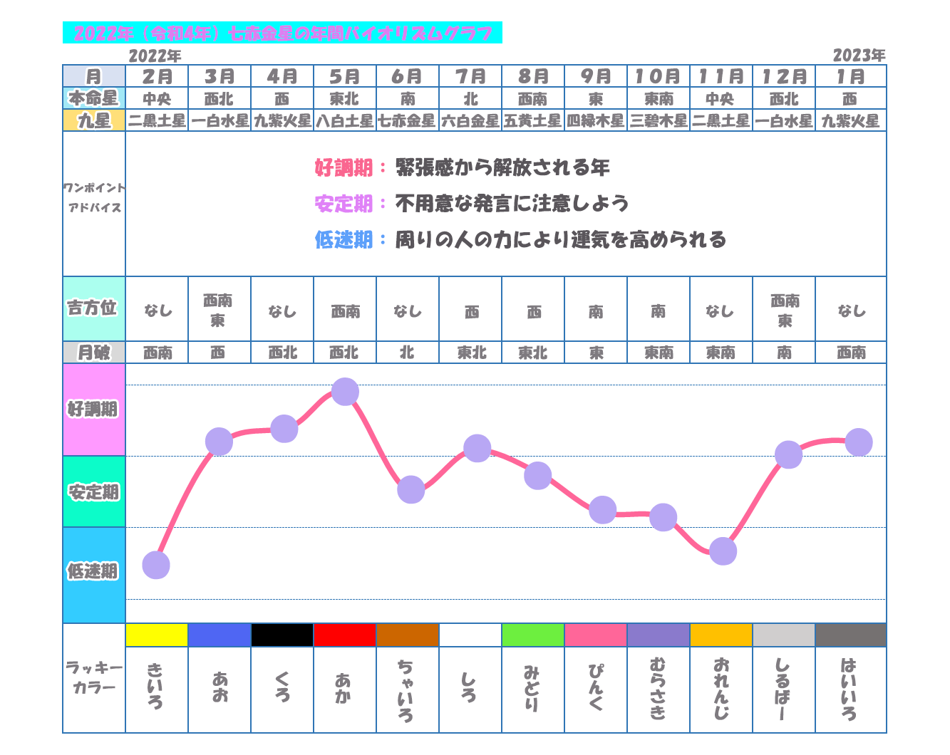 - 13 七赤金星・2022年の九星気学においての1年間の運気の流れ(2022年2月~2023年1月の運気のバイオリズム)