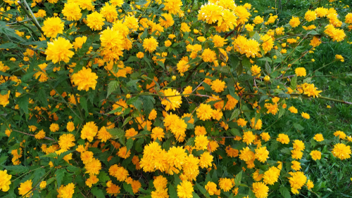 山吹色は、明るい黄色やオレンジ色の花を咲かせますよね。こんもりとした株にいっぱい花をつけます。
