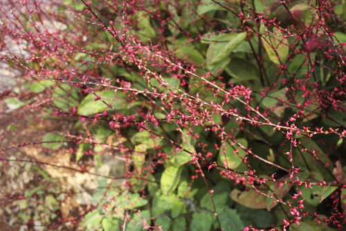 水引の花は、上から見ると赤くて下から見ると白い花です。細長い花穂に点々と花をつけます。