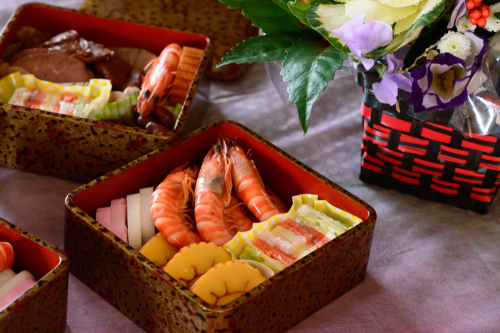 お祝い事なので、重箱に詰める料理は、赤かまぼこなどを使った、慶事用の料理。