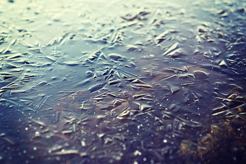 解けかけていた川や湖の氷が寒の戻りで再び凍り付いたものや、水たまりに張った薄い氷などのことで、陽射しを浴びると溶けてしまうような薄い氷のこと。