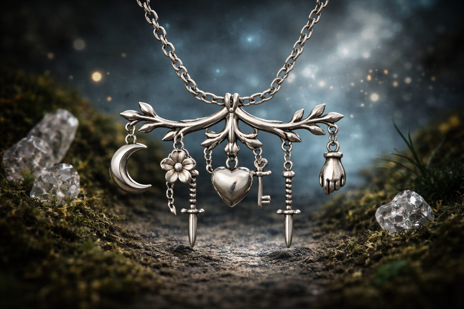 月や鍵などのモチーフが組み合わさることで、災いからの保護や直感力のサポートといった意味が加わり、身につける人のエネルギーを安定させるといわれています。