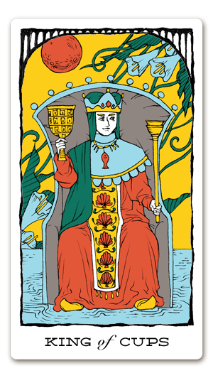 「カップのキング」のカードは、海の上の王座にどっしりと腰をかけ、慈愛の眼差しを持って全てのことを静観しています。情熱や憧憬を表す真っ赤な満月が浮かび、黄色い背景は権力や地位の高さを象徴し、水色の花々はこの人物が崇高で非常に高い精神性を持っていることを示しています。