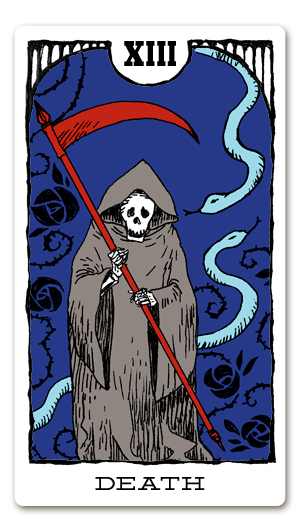 大鎌をふるい、次々人々を殺していくように、このカードが出てきたら、これまで続いてきた物事が突然終りを迎える、という暗示です。