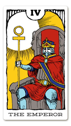 「皇帝」のカードは、威厳のある表情で青白いヒゲを豊かに携え、王者を表す赤い服とマントを身にまとった王様が、雄羊が横顔が彫刻されている玉座に堂々と座っている様が描かれています。