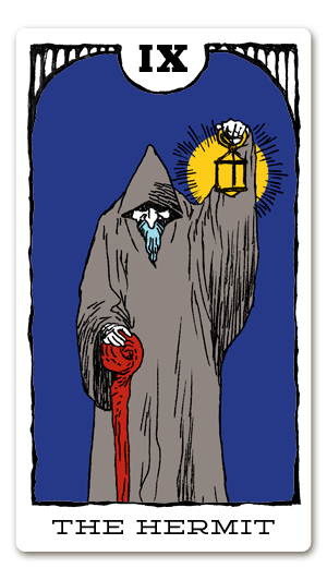 隠者が暗い道を孤独に歩み進めるように、このカードが出てきたら、一度一人になって、静かに自らのぞむ答えを探すように、という暗示です。