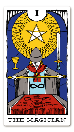 魔術師である彼は、これから偉大な魔術を成し遂げるため、4大元素を象徴する棒・ペンタクル・剣・カップを机に広げ、今しも魔術を披露しようとしています。
