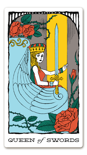 「ソードのクイーン」のカードは、高い精神性を象徴するブルーの玉座に腰をかけ、知的で冷静な表情でまっすぐにこちらを見つめていて、まるで自分の内面をも洞察してしまうほどの静けさを携えています。