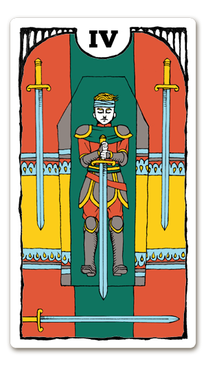 「ソードの4」のカードは、一人の男性が目を閉じて静かに横たわっています。手には一本の剣を持ち、静けさに満ちた表情をしています。