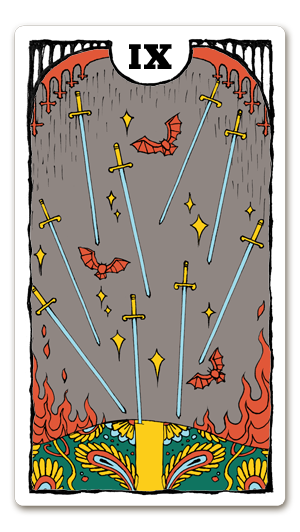 「ソードの9」のカードは、9本の剣が宙を舞っていますが、剣先は下に向けられ、何かを突き刺そうとしています。カードの下部は床に横たわる人間の腹が描かれていて、1本の剣は腹に突き刺さっており、危機的な状況が訪れようとしています。