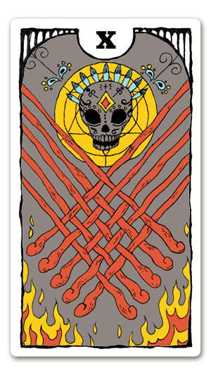 10本のワンドは自分にとって義務や責任の重圧、一人で重荷を背負うには大きすぎる仕事などの意味が込められてます。また中央の骸骨はあなた自身がその責任を感じ、背負うことによる結果を意味しています。
