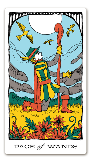 「ワンドのペイジ」のカードは、若い青年が一本の棒を握り、顎をあげて力強く空を見上げてひざまづいています。その表情は自信に満ち溢れ、これから起こる全ての出来事を受け入れ、前進しようとしています。
