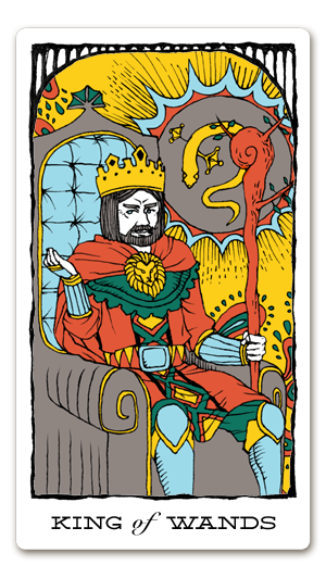 「ワンドのキング」のカードは、情熱と強い意志力や決断力を象徴する赤いローブを身にまとった王様が、背筋をまっすぐにして威厳たっぷりな表情で大きな玉座に堂々と腰をかけて座っています。