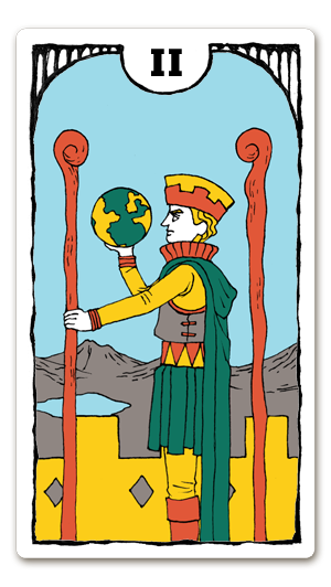 「ワンドの2」のカードは、一人の男性が遠くを見つめて立っています。一方の手には次なる夢やさらなる野望や情熱を象徴するワンド(棒)を持ち、もう一方の手には地球を手にしています。