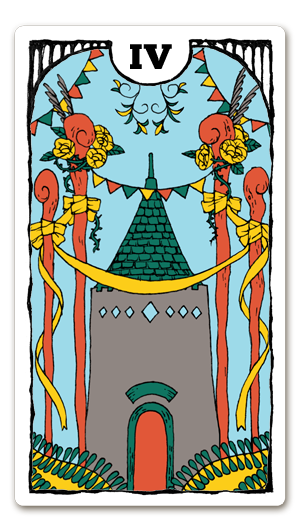 「ワンドの4」のカードは、お城や教会を思わせる建物が花とリボンで装飾され、これから始まる特別なセレモニーを予感させます。建物の中ではなく、建物の外側に華やかな装飾が施されているのは、そのお祝いごとが決して内輪のものではなく、外に向かって開かれていることを意味しています。