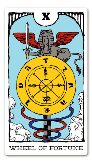 「運命の輪」のカードは、文字や記号が書かれた中央の円盤に赤い羽根を持つスフィンクスが座っていて、権力の象徴である剣を手に持っています。