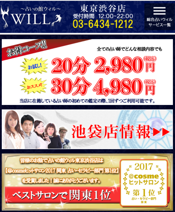 | 店舗名 | 占いの館ウィル東京渋谷店 | ||
