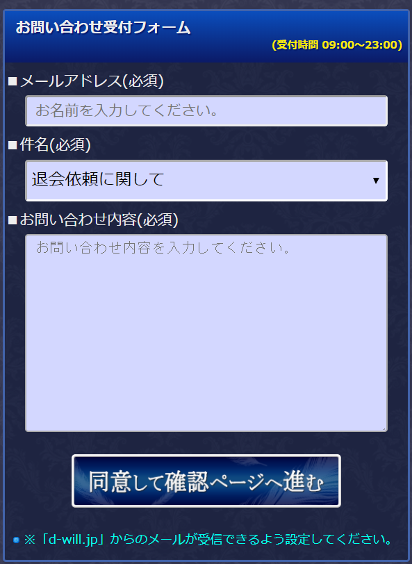 お問合せフォームから「退会依頼に関して」を選択し、メールアドレスを入力して送信すれば退会となります。