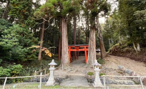 9つの頭を持つ龍神「九頭龍」である九頭大明神が御祭神となっており、鳥居前の二本の巨木が龍神をお守りしているかのようにも見えます。