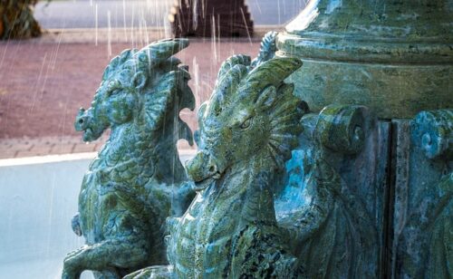- 水から飛び出そうとしている姿の龍頭の像がある