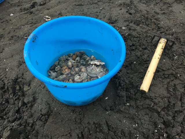 採った貝のうち持って帰る量に決まりがあり、大人800g子供400gまでです。潮干狩りの用具に関しては有料でレンタルもあります。