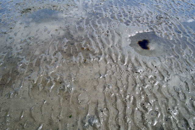 干潟に盛り上がった適当な場所がなく全体が平で少し掘るとすぐに海水が溜まるような場所では波の跡のでこぼこを見てください。