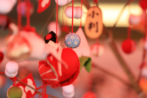 人形や毬(まり)などの縁起物を模って布で作ったものを、モビールのようにして飾るもの。