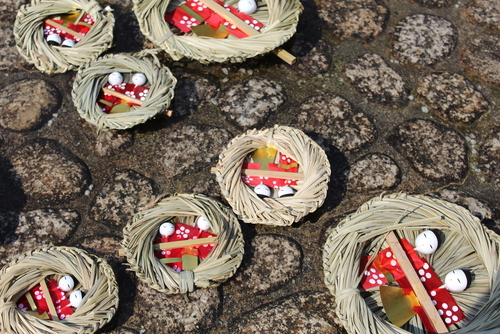 縁起が良いとされている、鶴やうさぎ、ひよこなどを模って作ったものと、色とりどりの糸を巻き上げて作る「柳川まり」と一緒につるします。