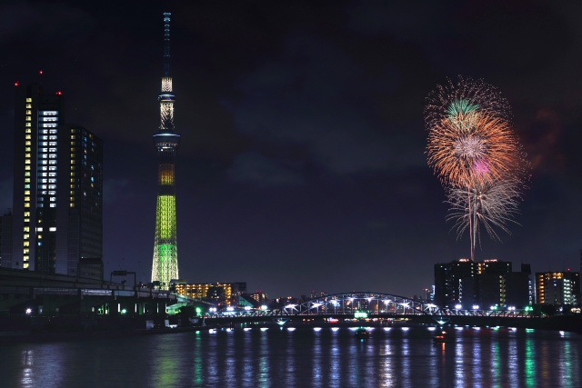 隅田川花火大会は、毎年7月の最終土曜日に隅田川付近で行われる花火大会です。都内は高い建物も多いので見え方さえ気にしなければ割と広範囲で鑑賞することができると思います。