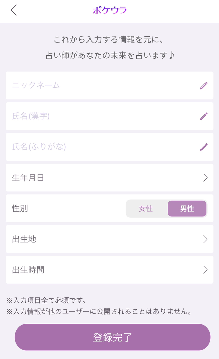 入力内容は、ニックネーム・名前・生年月日・性別・出生地・出生時間。