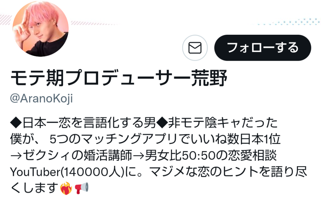 そんなモテ期プロデューサー荒野さんは恋愛テクニックを配信しているyoutuberです。そんなモテ期プロデューサー荒野について見ていきましょう。