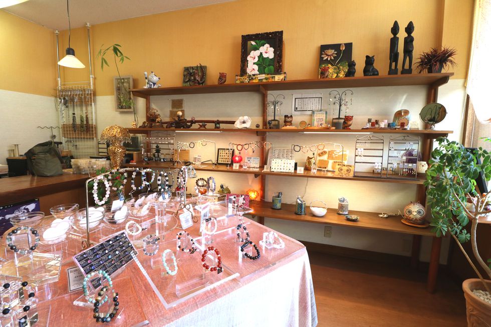 店内には、パワーストーンやアクセサリー、原石、浄化グッズなど1000種類以上ものアイテムがびっしりと並べられています。