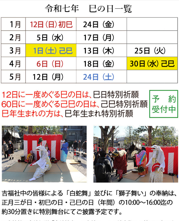 白蛇様のご縁日として、蛇窪神社では特別祈願を行っていますんで、参拝する日としておすすめです。