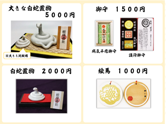 お神札や御札と共に白蛇の置物やお守りを購入することができます。