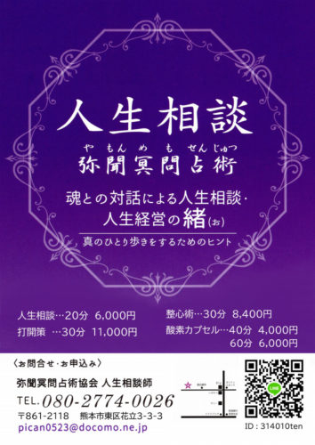 | 鑑定場所 | あなたの美癒健 〒862-0950 熊本県熊本市中央区水前寺1丁目32-10 |
