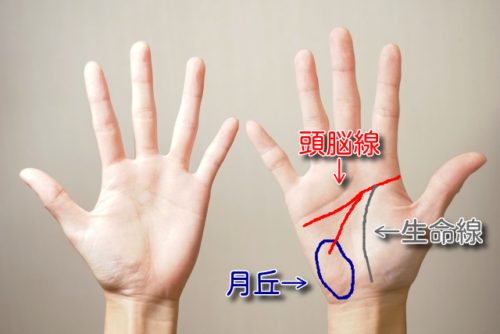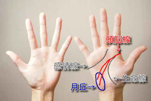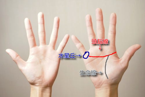その特徴を持つのが、親指と人差し指の間から出ている頭脳線が小指下あたりにある”水星丘”に伸びている場合となるのです。