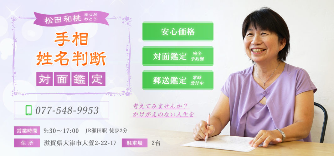 | 鑑定場所 | うらない処 ゆりかご 〒520-0832 滋賀県大津市粟津町2-56 カンサ石山201 | ||