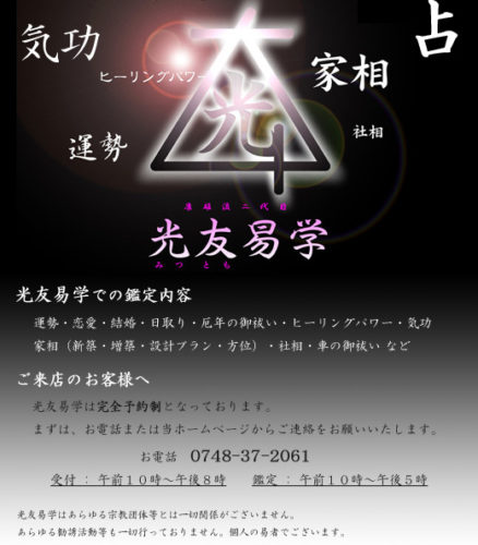 | 鑑定場所 | 占い塾 〒525-0032 滋賀県草津市大路1-1-1 Lty932・ガーデンシティ草津2F | ||