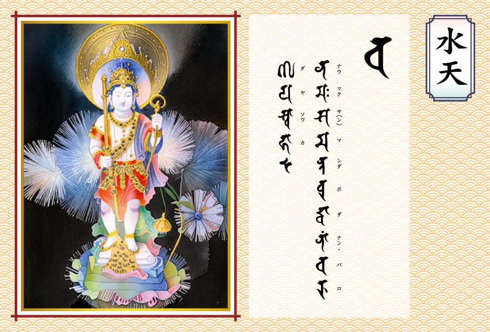 水天は水を司る神様であり、水天の真言を唱えることで水のように清らかな心を授かることができるとされています。