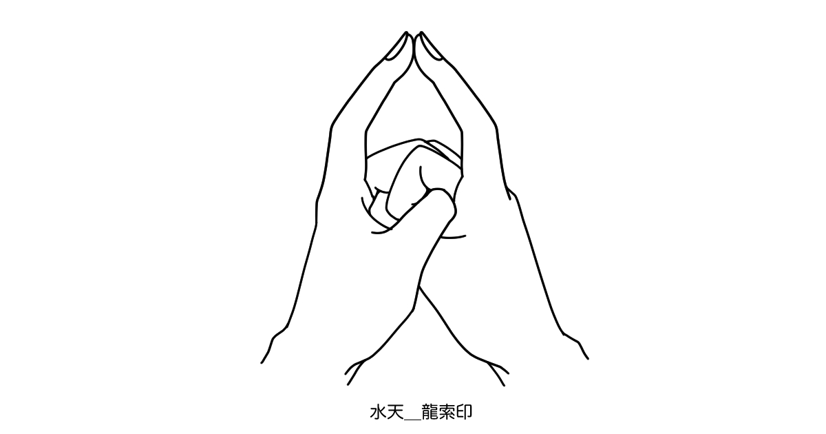 また、水天の手印は“龍索印”と呼ばれるものであり、両手の中指、薬指、小指は折り曲げて合わせ、人差し指は立てて指の腹を合わせます。
